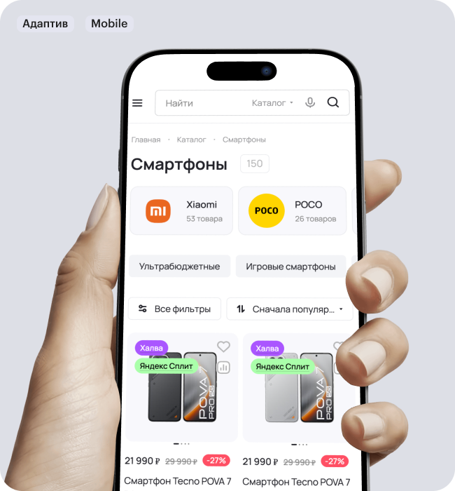 Независимый мобильный шаблон – мобильная версия сайта работает отдельно от десктопной, что обеспечивает высокую скорость, уникальный дизайн и удобный голосовой поиск. 85% посетителей заходит именно со смартфонов.
