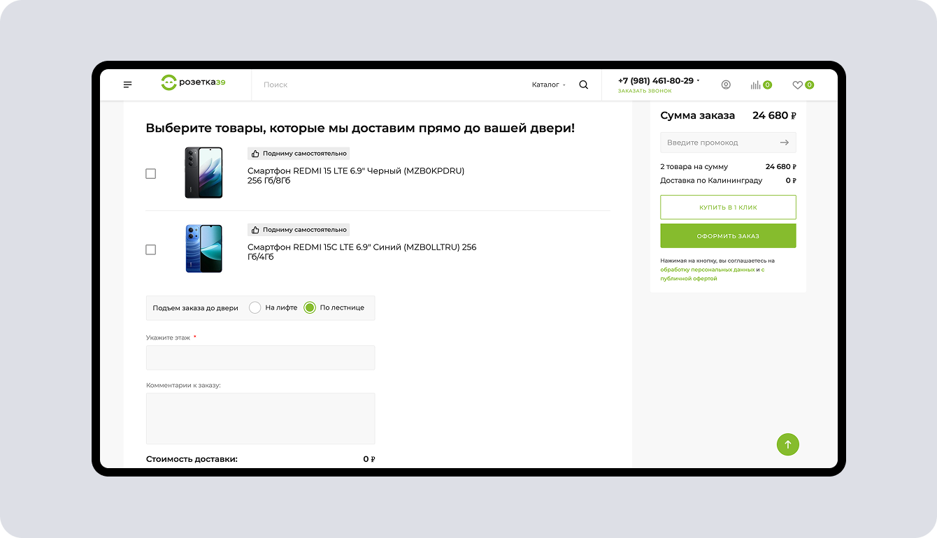 Клиент обратился к нам со стабильным трафиком, но низкой конверсией в оформление заказа (всего 12%). Пользователи часто бросали корзину на шаге «Доставка», так как не видели итоговую сумму.