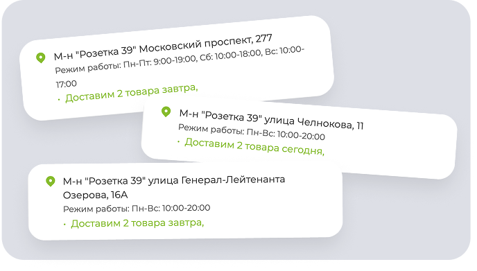 Внедрили выбор магазина из списка и на Яндекс картах с полной детальной информацией об адресе, режиме работы, фото и дате доставки товара до выбранного магазина, в зависимости от времени оформления заказа