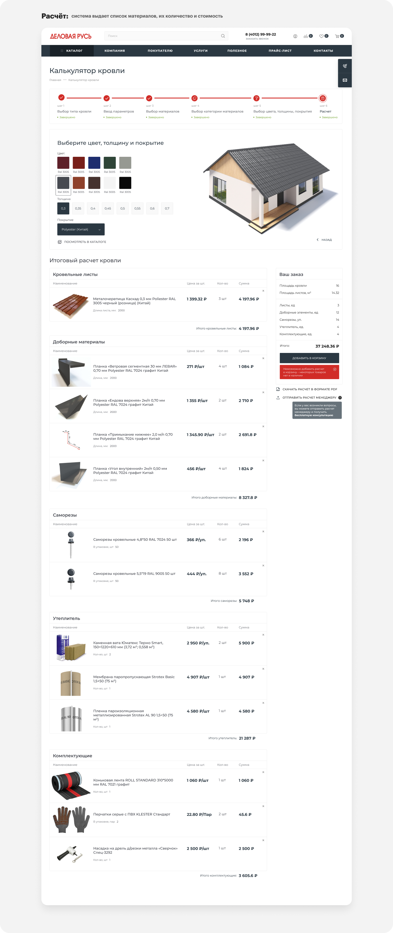 «Деловая Русь» — производитель и поставщик строительных материалов. Компания решила оптимизировать процесс расчета материалов для проектов клиентов. Для решения этой задачи был разработан «калькулятор кровли» — онлайн-инструмент, позволяющий точно оценивать потребность в материалах и комплектующих для кровельных работ.